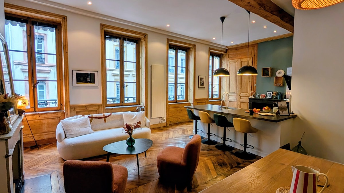 Explorez la ville depuis ce grand appartement situé dans un immeuble sécurisé avec ascenseur. Son style raffiné est accentué par le parquet, les moulures et la belle hauteur sous plafond. Vous dormirez à poings fermés dans la chambre sur cour. Appartement très calme situé en plein centre de la ville proche de tout. Très réactif à vos questions n hesitez pas. L'appartement est situé en plein cœur de Lyon, sur la Presqu’île, à proximité immédiate des grands magasins, de la place Bellecour et des principaux centres d’intérêt de la ville, comme le Vieux Lyon. Très pratique, le métro se trouve à quelques pas. Métro Cordeliers à deux minutes à pied, arret de bus à une minute.