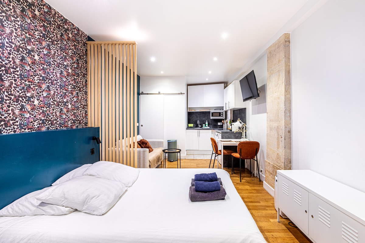 Šarmantni studio u tipičnoj zgradi starog Pariza Veliki studio od 25 m2, na 4. spratu, (bez lifta) u dvorištu. Renoviran s ukusom, sačuvao je autentičnost starih pariških stanova, ali sa svom modernom udobnošću. Prostor je miran i čist, ali bez direktnog sunca. Novi veliki klima-uređaj i ventilator DETALJ: Potpuno je obnovljen. MOBILIT ZA KAUCIJU je moguć za kraće ili srednje boravke od nekoliko mjeseci