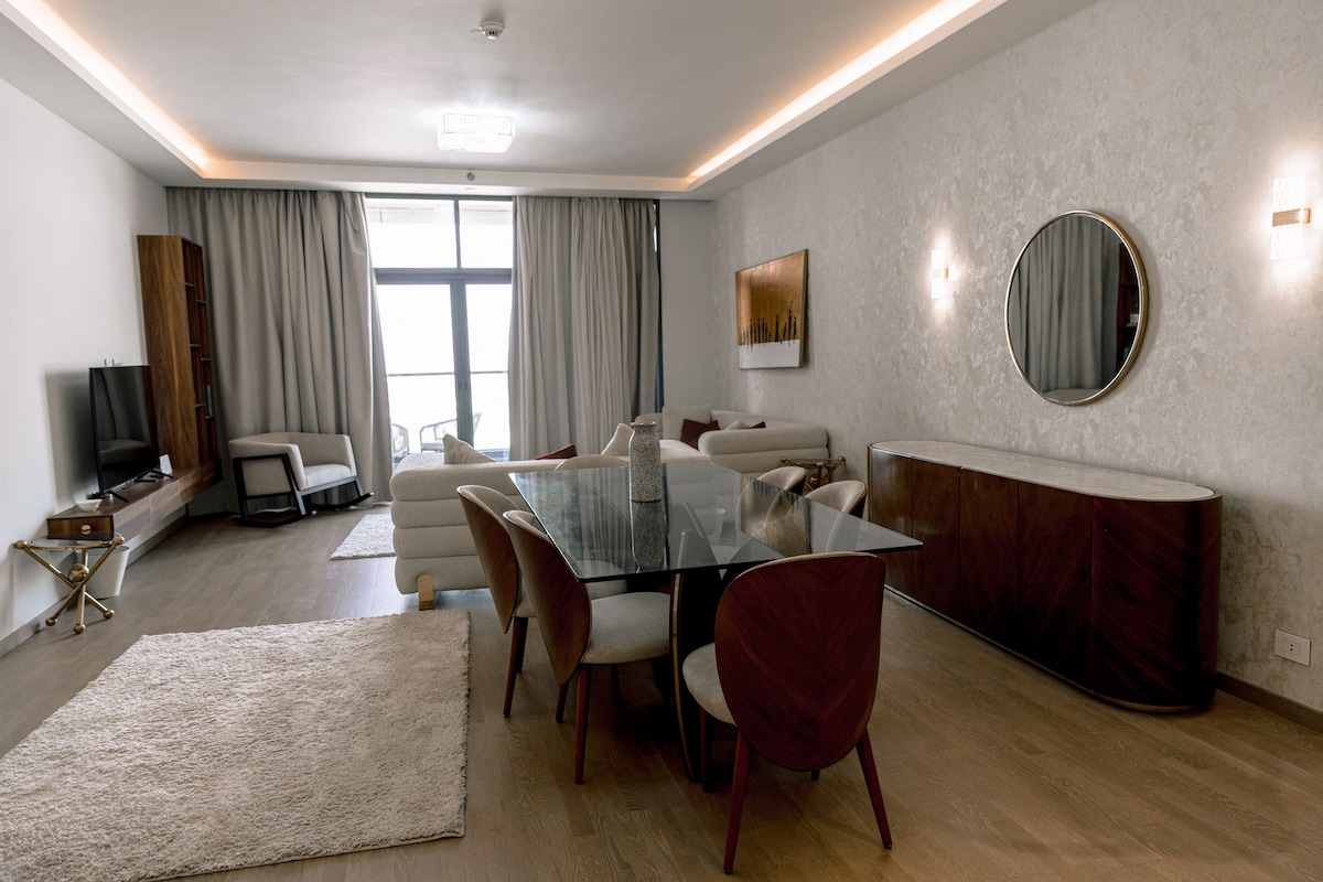Your Manor in the Sky Welcome to one of our ELITE's, an expansive and exquisitely designed three-bedroom residence in the prestigious Aeon Towers. This is a home that combines the space and elegance of a manor with the breathtaking views and modern conveniences of high-rise living. Perfectly suited for families or groups, this apartment offers a sophisticated retreat with direct access to the vibrant lifestyle of the Mall of Arabia and a host of exclusive, resort-style amenities.