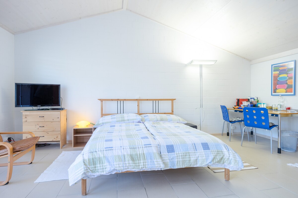 Das helle Studio (ca. 37 qm) befindet sich in einem ruhigen Einfamilienhaus Quartier in Muri, Kanton Aargau. Das Studio ist ausgestattet mit 1 Doppelbett (Queen-size), Tisch mit 2 Stühlen, Kleiderschrank, Sofa, kleine Küche mit Pfannen, Geschirr und Besteck (kein Backofen, keine Microwelle), Kaffeemaschine, Wasserkocher und Kühlschrank. WLAN ist vorhanden. Badezimmer mit Dusche/WC. Bettwäsche, Bade- und Küchentücher stehen zur Verfügung. Der Parkplatz istdirekt vor dem Studio.