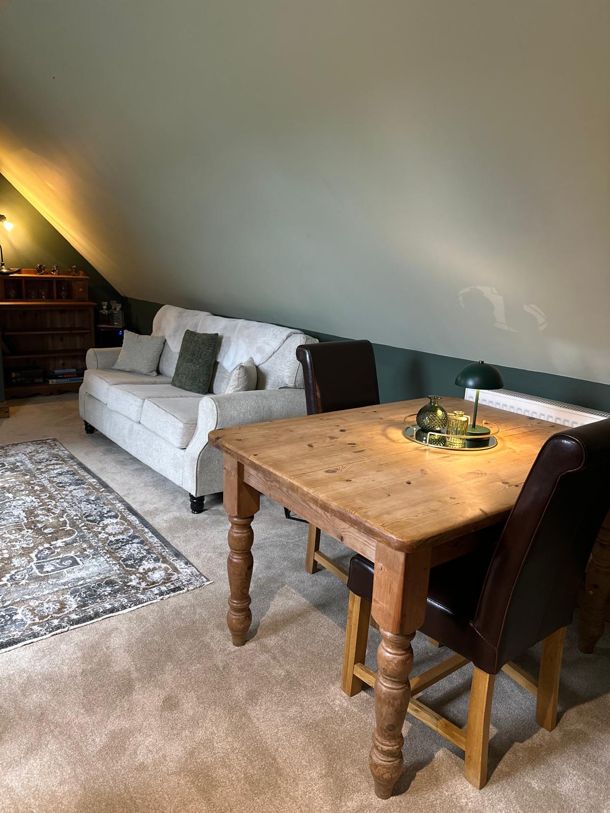 Our self-contained, ground-floor studio apartment for two guests, is one of just two units on site. It is a retreat, a practical workspace, or a convenient base for exploring. The kitchenette has a fridge, microwave, hot plate, toaster, and mini-oven, for cooking meals in . Fully equipped shower room, electric shower. The main area, has a king-size bed, sofas, a table and chairs, a log burner. It benefits from its own private entrance via a shared corridor with the upstairs apartment.