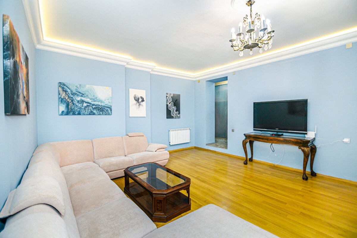 Historic 2-BR apt on vibrant Nizami St, inside the iconic Qara Qarayev Museum building! Sleeps 6. Experience Baku's heart with this unique blend of historic charm & modern comfort. Features a fully equipped kitchen, AC in every room, and high-speed Wi-Fi. Perfect for families & groups exploring the city center on foot.