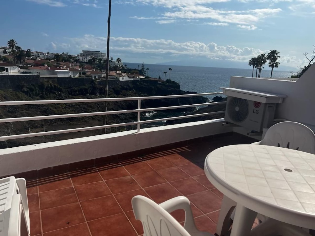 Penthouse na prvoj liniji s pogledom na okean od zida do zida i noćnim zalascima sunca. Novouređeni, klimatizovani i dizajnirani za udobnost: bračni krevet s vrhunskom posteljinom, tuš kabina, roletne za zamračivanje i električna pergola. Kuhajte u potpuno opremljenoj kuhinji (mašina za suđe, rerna, Nespresso), a zatim se opustite pored velikog bazena uz okean s vlastitim ležaljkama za sunčanje. Brzi internet i radni prostor s pogledom na okean. Prošetajte do Playa de la Arene i restorana uz more. Besplatan parking ispred ulaza na ulici.