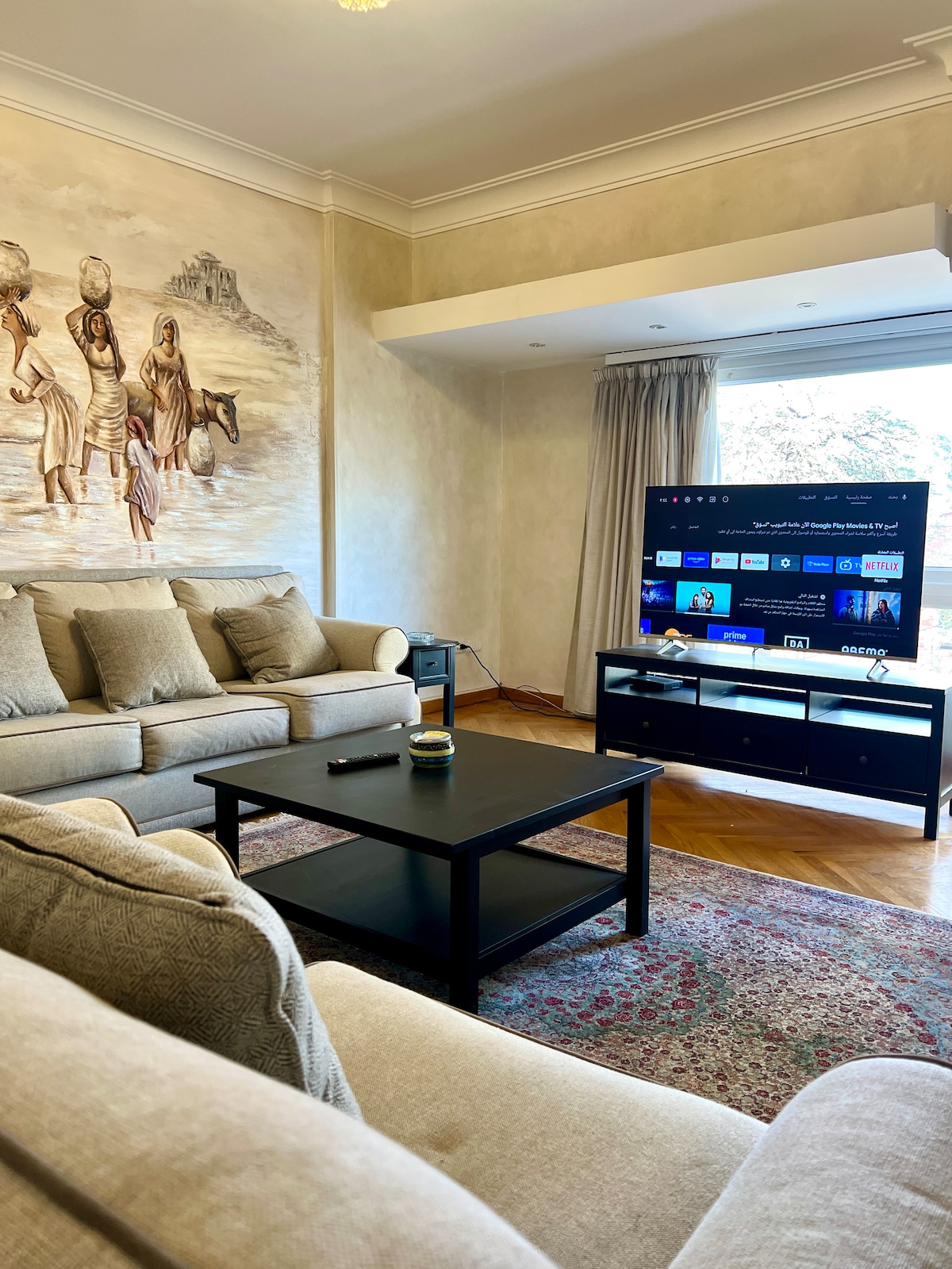 Prostran i svijetao trosoban stan u srcu Maadija, pogodan i za profesionalce i za njihove porodice u poslovnoj posjeti; ili grupi prijatelja koji otkrivaju skrivene dragulje grada. Nudi zadivljujući pogled na Nil i nalazi se na pješačkoj udaljenosti od stanice metroa s direktnim pristupom kvartovima Kaira. U blizini se nalaze prodavnice hrane, restorani, kafići, fitnes centri i vešernica, a također su dostupni i usluge dostave. Naš stan je spreman da vam poželi dobrodošlicu!