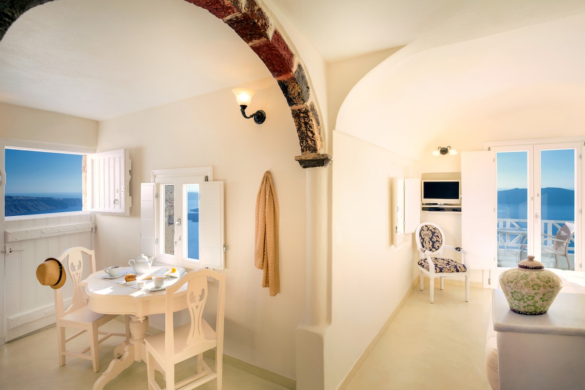 Ovaj elegantni apartman se nalazi na liticama kaldere u Oiji. Kombinuje tradicionalnu cikladsku arhitekturu s minimalističkim dekorativnim stilom, što ga čini savršenim izborom za one koji se žele opustiti. Apartman je veličine oko 37 m2, ima privatnu vanjsku masažnu kadu u pećini, nudi privatnost zajedno s prekrasnim pogledom na kalderu i vulkan. Doručak je uključen u cijenu. Soba je opremljena klima uređajem, besplatnim Wi-Fi mrežom, opremom za pripremu kafe i čaja, sadržajima za kupanje i pametnim TV-om.