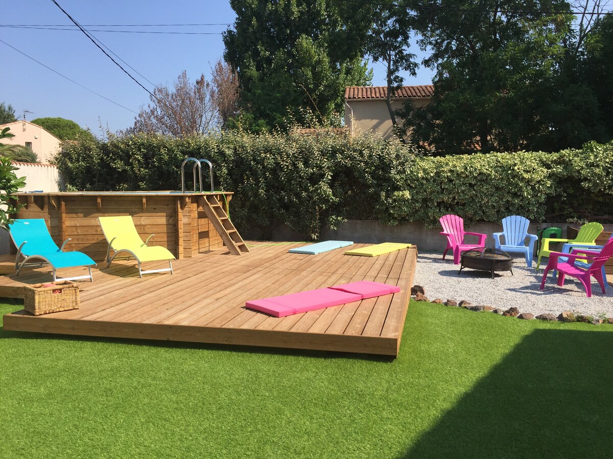 .Vila blizu mora s bazenom i masažnom kadom. Želite li odmor uz šarenu i porodičnu atmosferu? Provedite trenutak u ovom tradicionalnom, tipičnom i živahnom ribarskom selu. Le Grau d 'Agde zna kako ugošćavati plaže, prodavnice, usluge, svakodnevnu pijacu... - 500 m od Notre Dame de l 'Agenouillade (kapela) - 700 m od aukcije. (nezaobilazna destinacija) - 1,5 km do plaže u mirnom kvartu. Osmišljen je da provede sretne trenutke s porodicom ili prijateljima, u tišini.