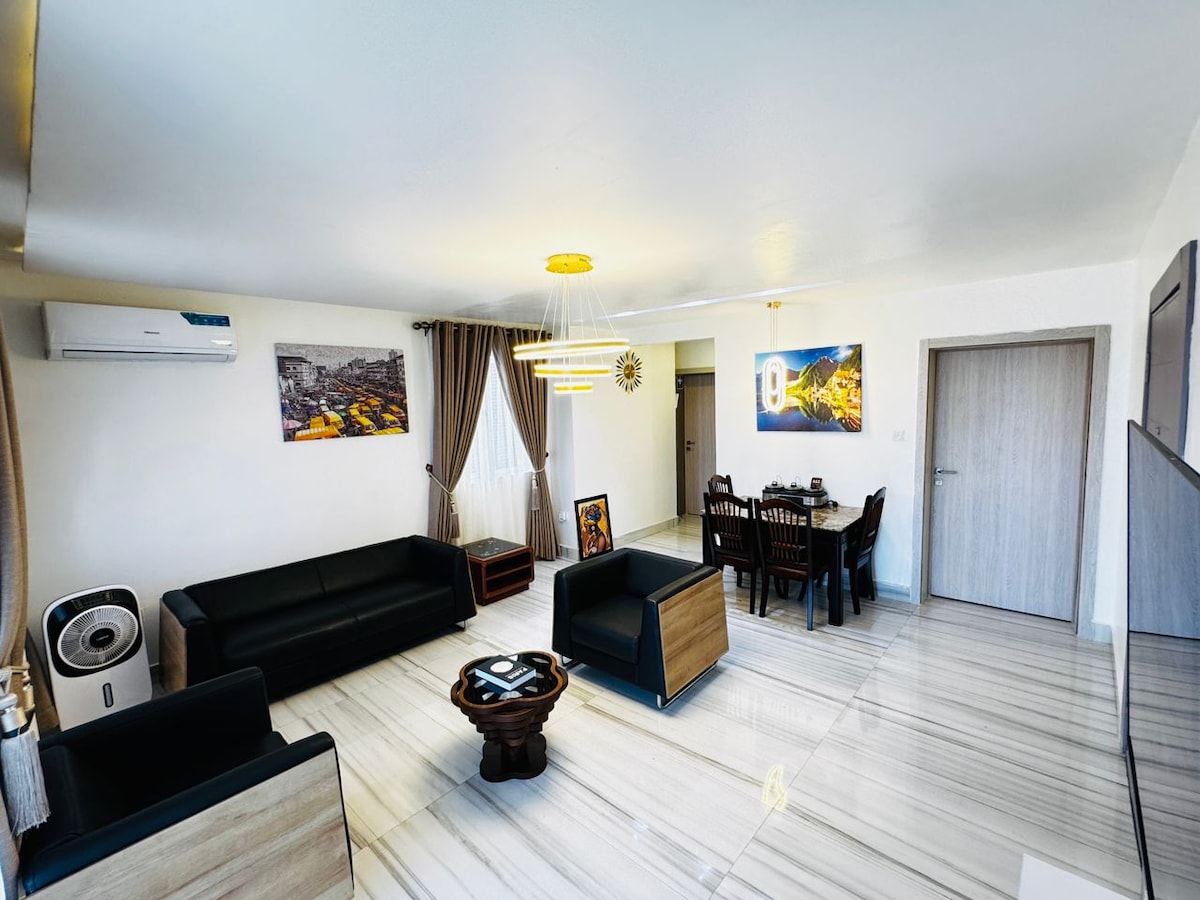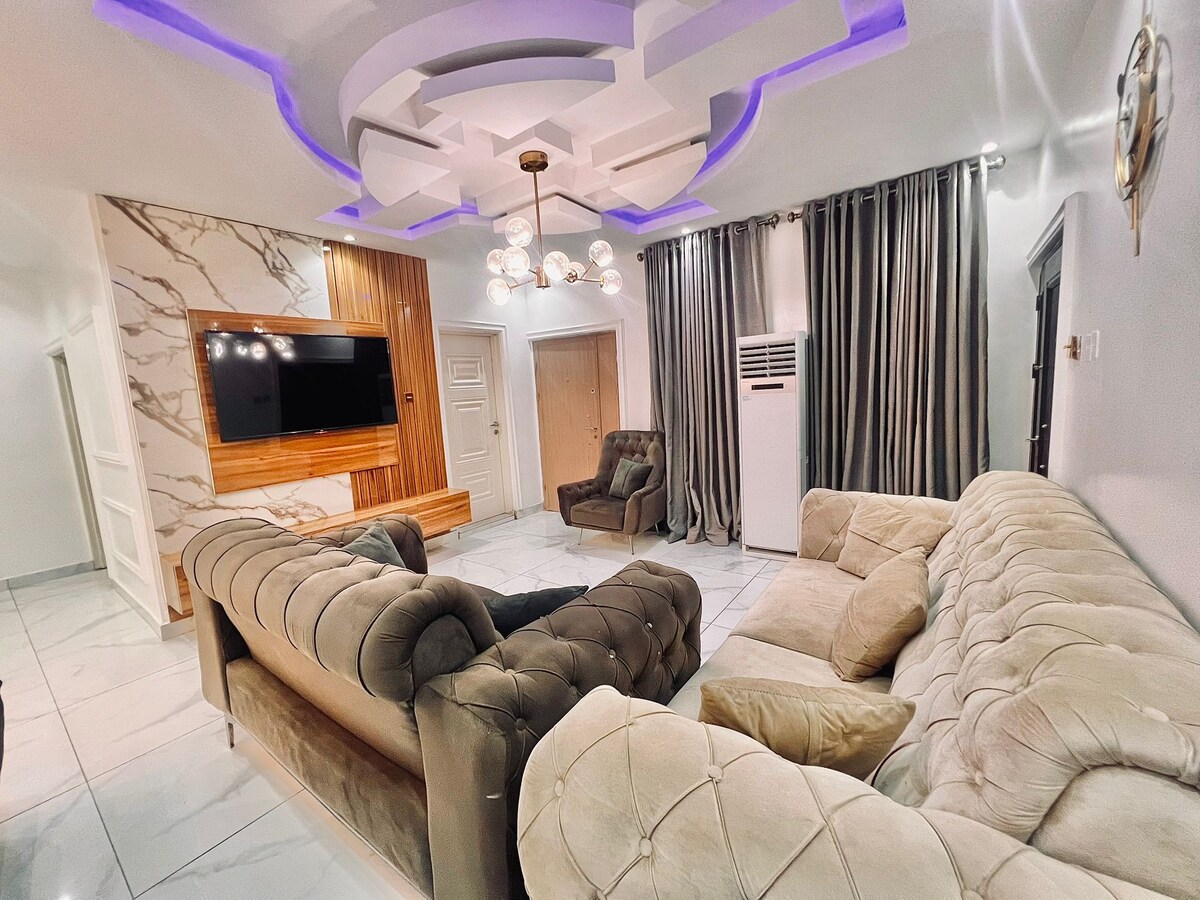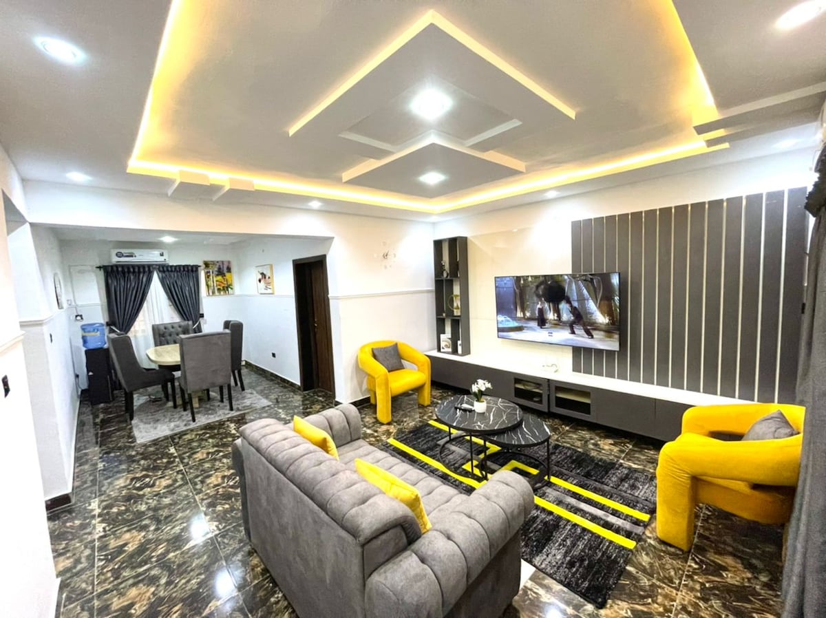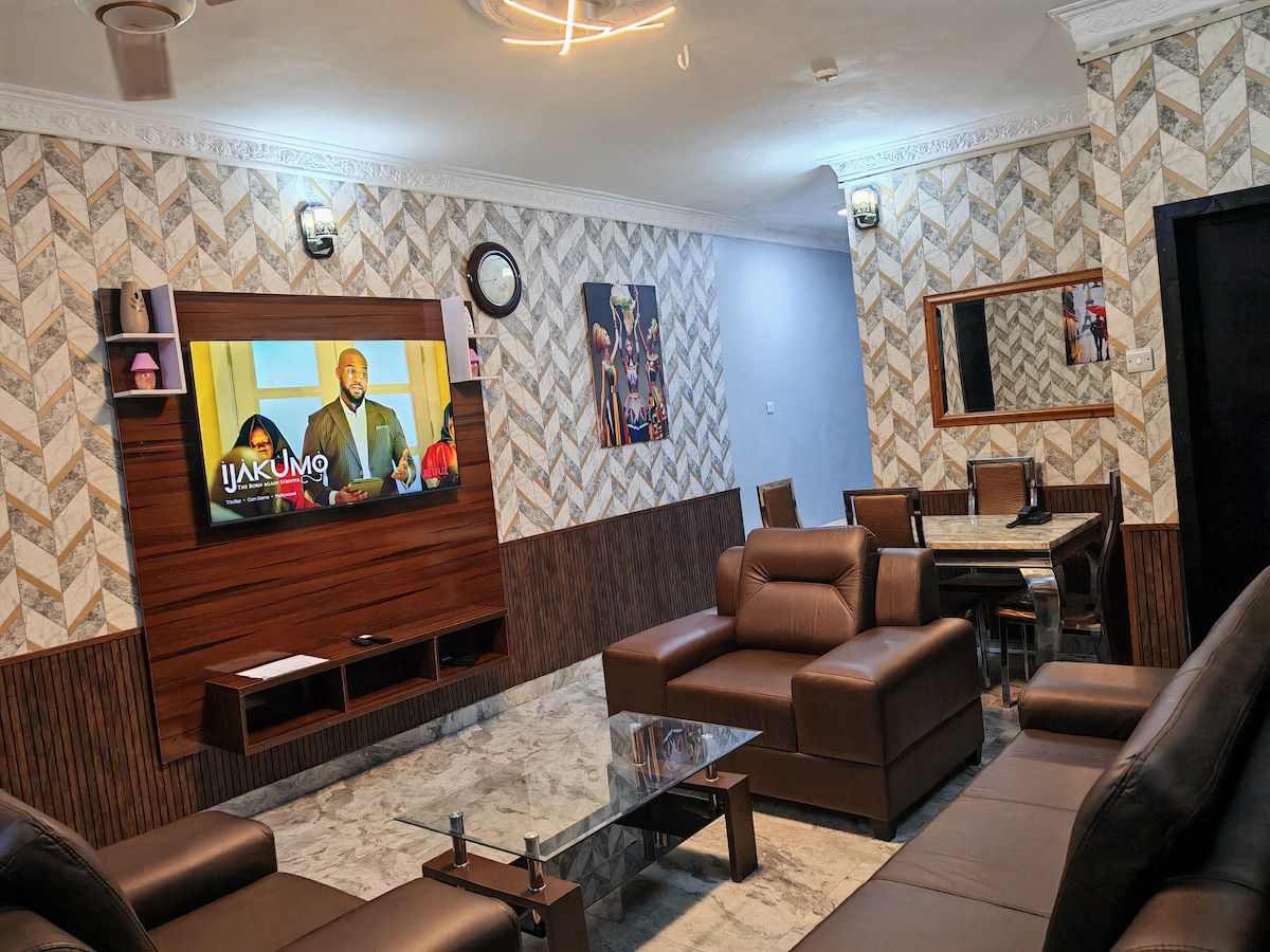 Pobjegnite u mirnu oazu Olumidea u srcu grada! Naš luksuzni trokrevetni stan s 33Kva transformatorom garantuje neprekidno napajanje električnom energijom. Opustite se sa stilom uz naše plišane bračne veličine i dva smještaja za bračni krevet, od kojih svaki ima privatna kupatila, za vrhunsku udobnost. Ostanite povezani uz brzi Wi-Fi, uz pomoć pomoć generatora u pripravnosti! i Netflixom s našim pametnim televizorima od 65 i 42", potpuno opremljenom kuhinjom i privatnim balkonima. Savršeno za dugoročne boravke, porodice i grupe. Rezervišite sada i opustite se sa stilom
