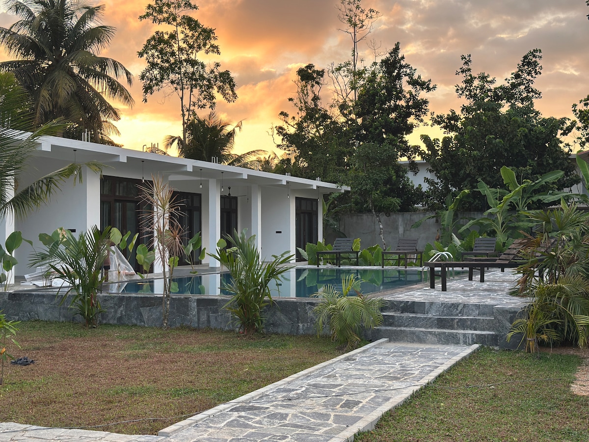 Pored diskretnog ulaza nalazi se mala luksuzna vila na rubu sela. Skriven je na malom brdu u pola hektara zelenog tropskog vrta s bazenom od 12 metara. U blizini restorana i prodavnica UNESCO-ove tvrđave World Heritage Galle i u blizini poznatih surferskih plaža na južnoj obali. Savršen odmor ili utočište za punjenje ili stvaranje remek-djela o kojem ste oduvijek sanjali. Kuća je dobro opremljena, uključujući solarne panele i baterije, tako da nema prekida napajanja.