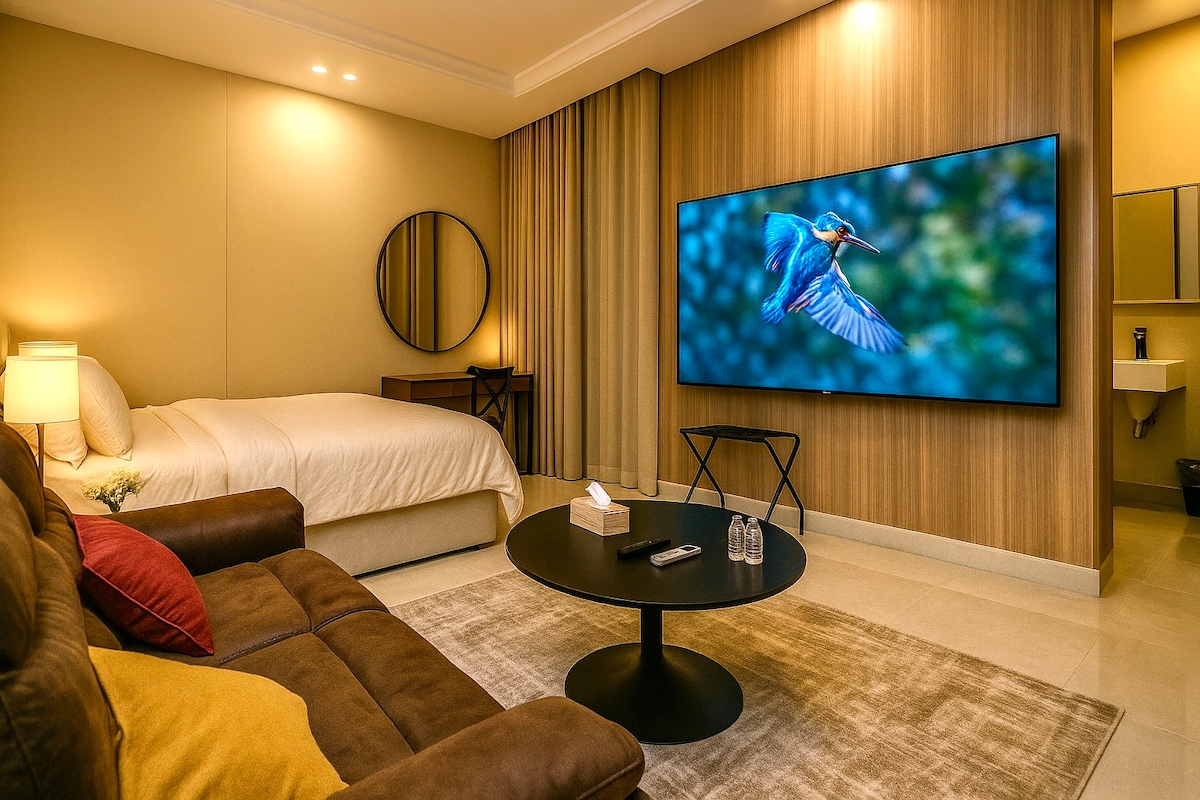 Uživajte u jedinstvenom doživljaju u privatnoj spavaćoj sobi koja nudi opuštanje i udobnost. Stan uključuje krevet i dnevni boravak gdje možete uživati gledajući na 55-inčnom pametnom ekranu. Tu su i kuhinja i kafa kako bi zadovoljili sve vaše potrebe. Hotelska spavaća soba s pametnim pristupom i udobnim dizajnom 5 minuta hoda do tržnog centra Al-Ahsa 5 minuta hoda do parka kralja Abdulaha 10 minuta automobilom do Univerziteta King Faisal 10 minuta automobilom do Umjetničkog fakulteta 10 minuta automobilom do Međunarodnog aerodroma Al-Ahsa 15 minuta automobilom do željezničke stanice Kafići su u blizini restorana Studio s udobnim dizajnom Luksuzna završna obrada
