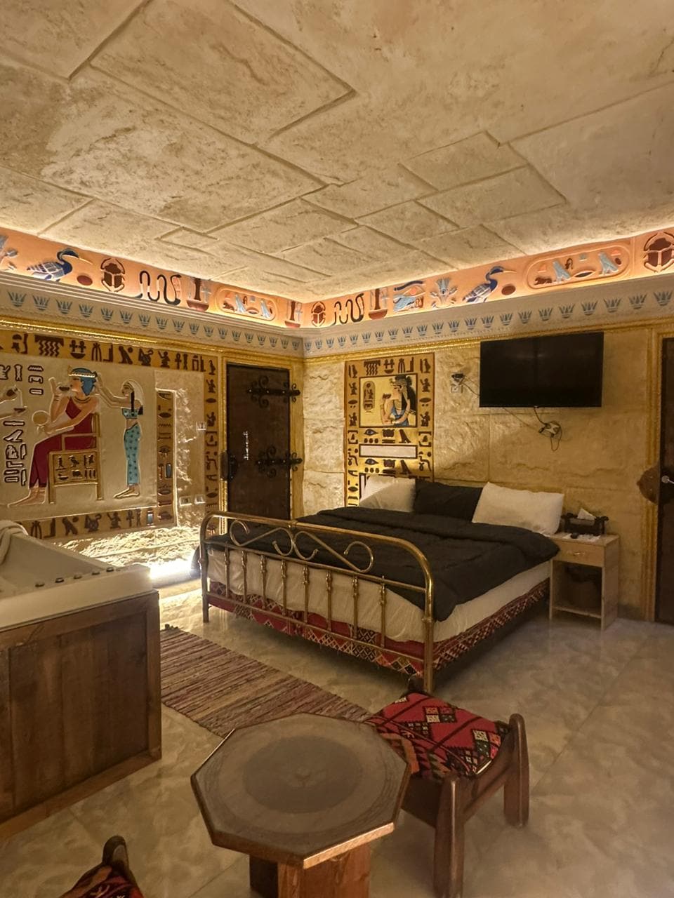 Wake up to the Pyramids glowing in golden light just beyond your window. Carved in the spirit of Ancient Egypt, our boutique stay features temple-style stone walls, elegant hieroglyphics, and pharaonic art that feels timeless. Sink into plush beds, enjoy serene air-conditioned rooms, and begin your day with a traditional Egyptian breakfast on a panoramic terrace. Unwind in a Jacuzzi overlooking the Pyramids, as attentive staff turn every moment into a memory.