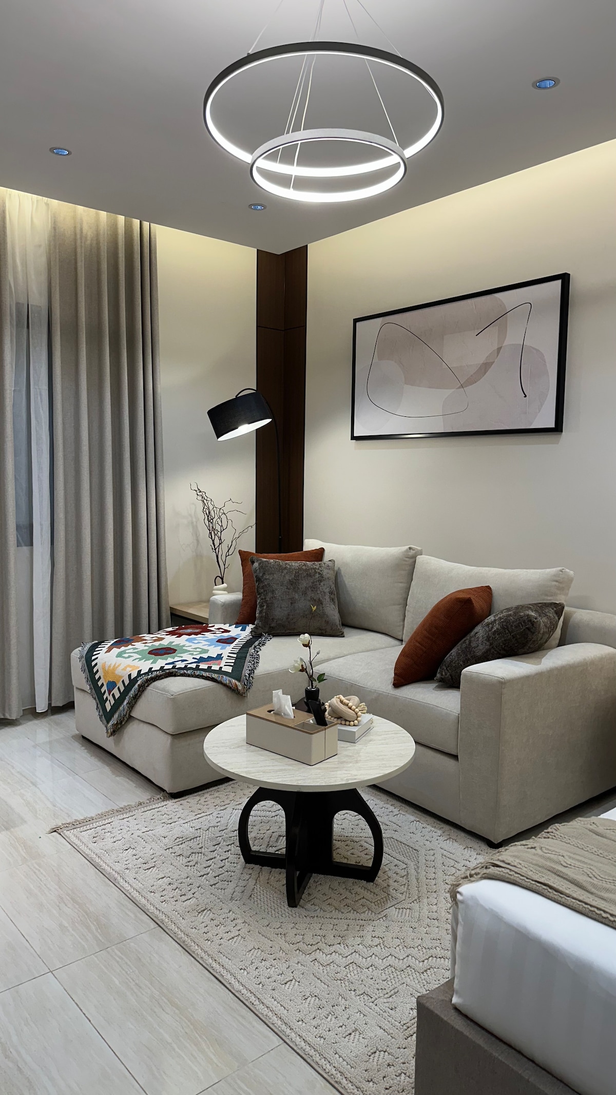 Luksuzni studio s direktnim pogledom na most Bahrein i more, strateški smješten u blizini tržnog centra Shubaili. Dizajn je elegantan i tih, s toplim bojama i uravnoteženim osvjetljenjem koje daje otmjen hotelski ugođaj. Prostor za spavanje je opremljen luksuznim krevetom i modernim dekorom, s drvenom pregradom koja pruža privatnost i visok dizajnerski štih. Termin je udoban s kožnim kaučem i detaljima od krzna koji dodaju toplinu prostoru, pored urednog radnog prostora s LED ogledalom i sobnih biljaka koje daju duh i sofisticirani karakter. Smještaj je savršen za one koji žele udobnost, privatnost i visok ukus za malu porodicu i putnike koji traže drugačiji smještaj i blizu svih usluga