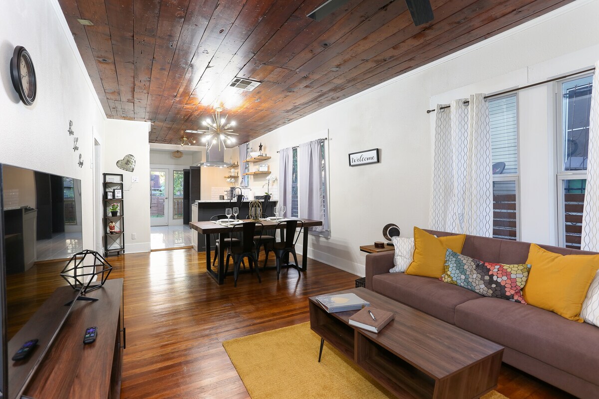 3 SPAVAĆE SOBE | 2 KUPATILA • Besplatan parking • Pješačka udaljenost do Alamodomea, River Walka i Alama Poboljšajte svoj boravak u San Antoniju u The Urban Chaletu, potpuno obnovljenom viktorijanskom domu iz 1900-ih u jednom od najživljih kvartova u centru grada. Uživajte u modernim sadržajima, dizajnerskim detaljima i nenadmašnom pristupu glavnim atrakcijama grada, a sve to na pješačkoj udaljenosti ili kratkoj vožnji. Bilo da putujete poslovno, porodično ili na zabavan odmor, spajamo luksuz vrhunskog boravka s toplom udobnošću doma.