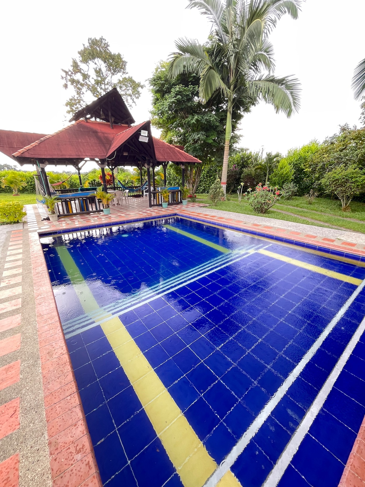 Disfruta de la sencillez de este alojamiento tranquilo y céntrico. Hermosa finca campestre, eje cafetero, cuenta con: Piscina, kiosco bbq, terraza, solárium, amplia zona de parqueo, 4 habitaciones, 4 baños y cocina campestre. Espacio Perfecto para disfrutar en Familia. A minutos de Quimbaya, Alcala y Montenegro