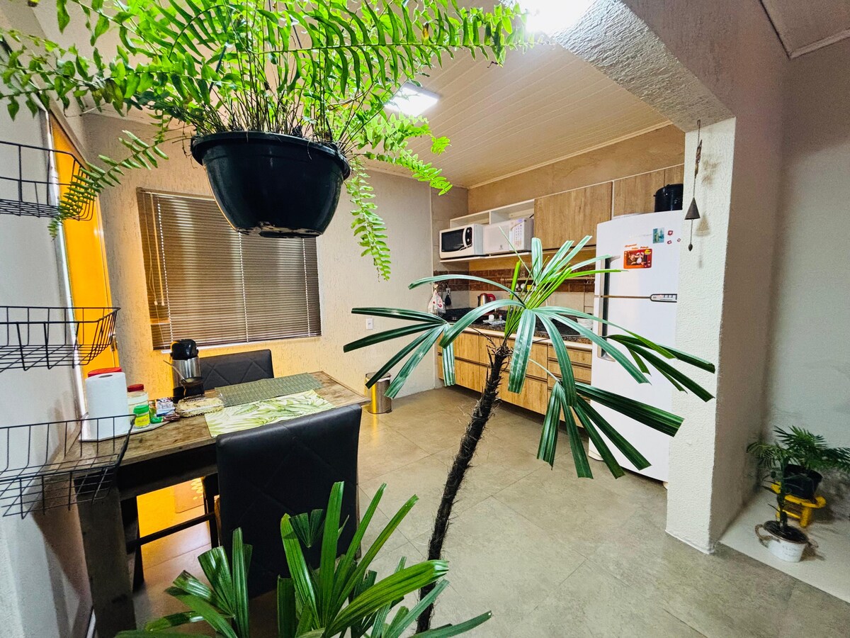 Casa sobrado, com dois quartos, sendo um quarto de casal com ar condicionado e outro quarto de solteiro com ventilador, sala de estar com lareira, cozinha conjugada, semi mobiliada, com fogão, chaleira elétrica, microondas, air fray, geladeira, possui dois banheiros e tem estacionamento gratuito.
