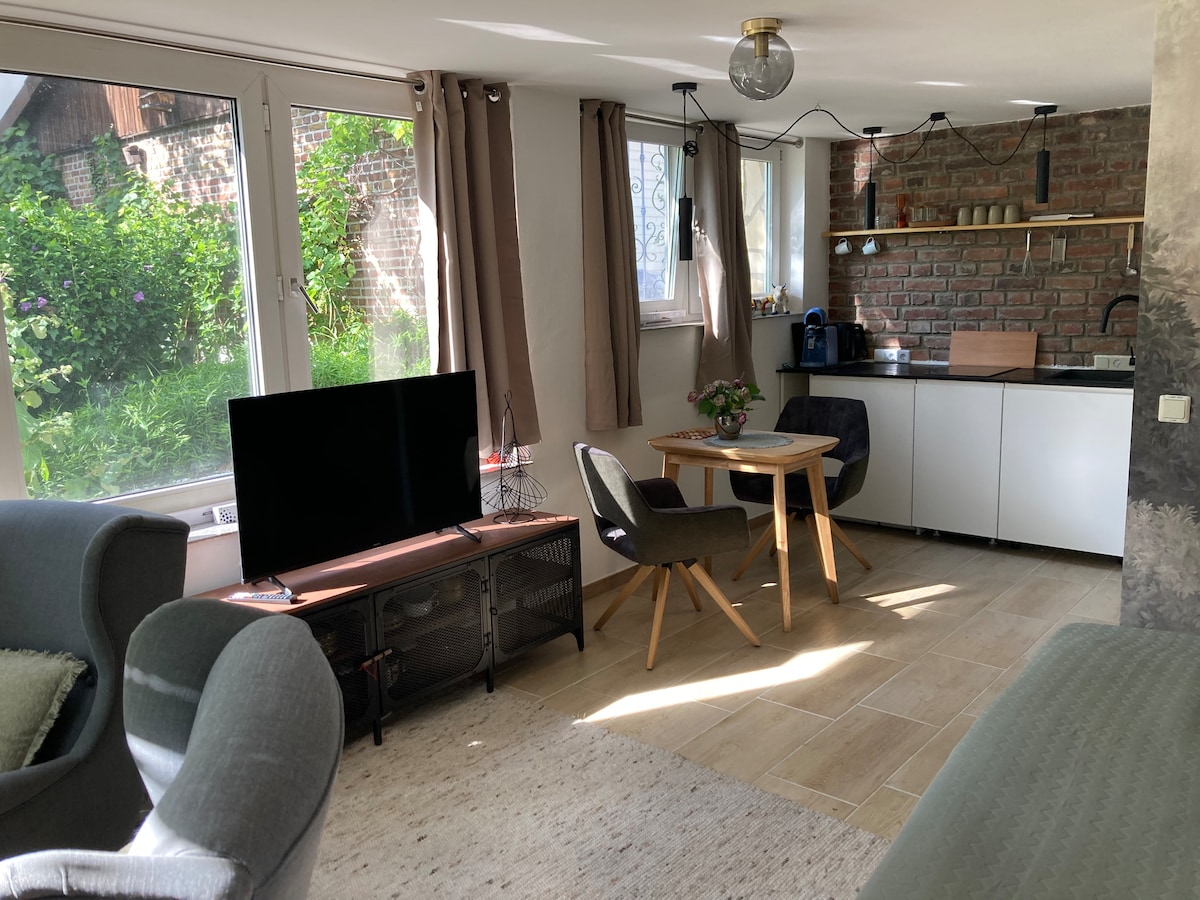 Nalazi se na selu, a ipak blizu Bonna i Kelna, oko 60 m2, privatni ulaz, pored oko 15 m2 južne terase na velikom vrtu sa starim drvećem. Imajte na umu da se zbog blizine vrta u stanu također može izgubiti insekt. Stan je opremljen s dvije velike sobe, integrisanom kuhinjom , hodnikom i kupatilom. Korištenje vlastite saune stana moguće je uz malu naknadu. Korištenje vrta je moguće po dogovoru.