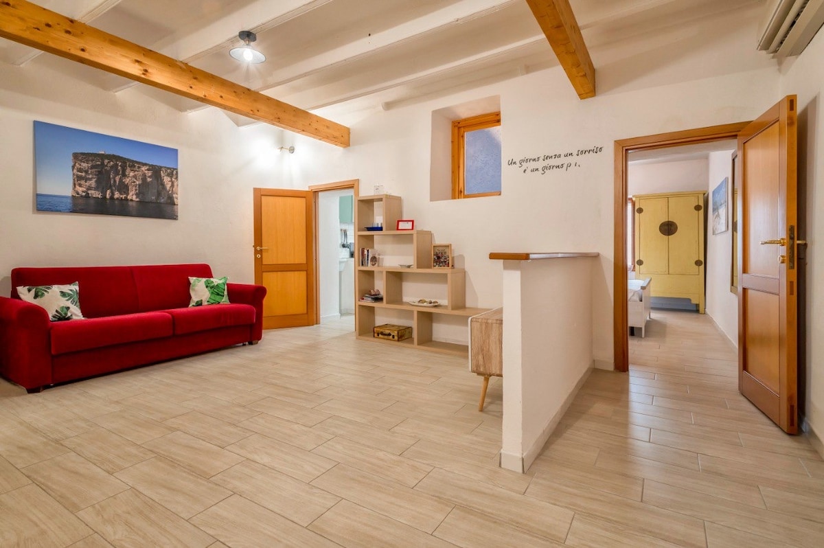 Novi stan 300 metara od mora, svijetao, šaren i tih. Idealan za grupe, porodice i prijatelje, s 2 velike spavaće sobe. Klima uređaj u svakoj prostoriji , Wi-Fi, 3 LED televizora. Hi-fi stereo, mašina za suđe, mašina za pranje veša. Pažljivo i s detaljima su ih opremili drvenim umjetnicima i vizionarskim dekoraterima. Sve je udobno , čak i besplatan parking ispod kuće 10 minuta hoda do centra i luke Alghero. IDEALNO