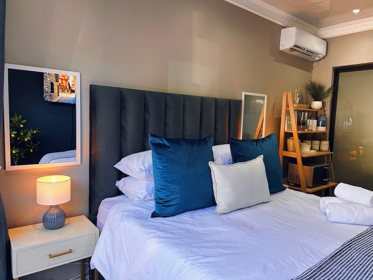 Luksuzni studio ima bračni krevet i privatno kupatilo. Uživajte u Wi-Fi mreži, klima-uređaju i pametnom TV-u s DStv-om i Netflixom. Dobro opremljena čajna kuhinja s plinskim plamenikom, mikrovalnom pećnicom i frižiderom pruža praktičnost vašem boravku.