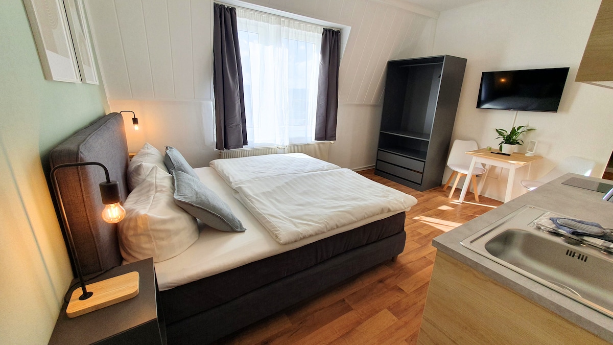 Moderan i udoban studio apartman (24 m2) s čajnom kuhinjom i besplatnim parkingom na privatnom parkingu. Kupatilo s dnevnim svjetlom, prostranim tušem i SMART TV-om s kablovskom televizijom. Čeka vas veliki i udoban krevet s oprugama 180 x 200. Posteljina i peškiri su obezbijeđeni. Infrastrukturno vrlo dobra lokacija. Direktna blizina Elbeparka, autoputa, biciklističke staze Elbe i Radebeula. Autobuska stanica odmah ispred kuće i tramvajska stanica udaljena oko 5 minuta.
