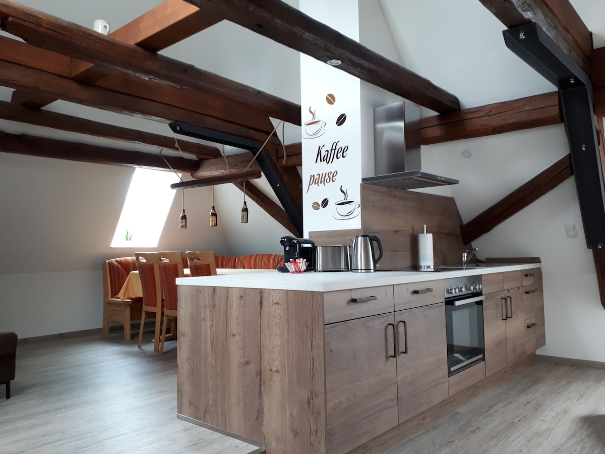 Novouređeni stan od 50 m² za najviše 3 osobe uključuje kuhinju, kupatilo, kao i zajednički prostor za spavanje, dnevni boravak i trpezariju za samostalan boravak. Pristup stanu putem vlastitog ulaza koji se može zaključati. Idealno za studente, radnike i porodice. Centralna polazna tačka za gradove kao što su Nürnberg, Bamberg, Würzburg itd. U selu su dostupne prodavnice za svakodnevne potrebe, apoteka i restorani (italijanski i grčki, kao i frankonijski specijaliteti).