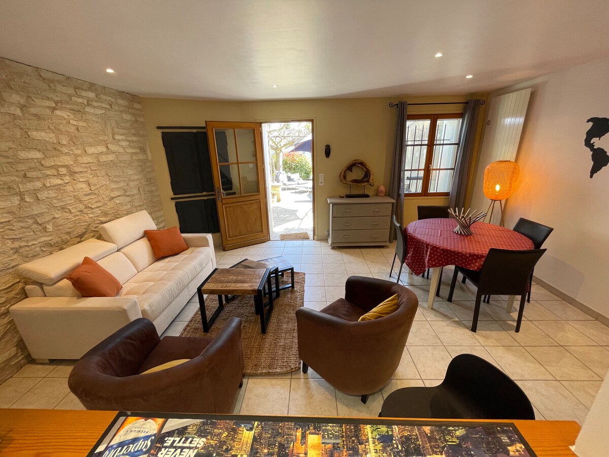 Opustite se u ovom mirnom i elegantnom prostoru, svježe renoviranom i uživajte u udobnom i umirujućem rasporedu. Da biste ispunili ovaj opis, imat ćete pristup balneoterapiji, sauni, tuš kabini, stolu za masažu (postavljenom na zahtjev), kao i svim potrebnim sadržajima (potpuno opremljena kuhinja, TV s Netflixom, Wi-Fi, električni kamin i mali i japanski WC). Malo brige vas čeka...!