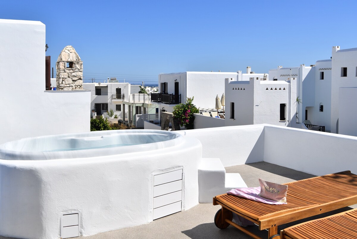 Naša tradicionalna cikladska kamena kuća (65 m2) nalazi se u centru sela i ima prekrasan vrt s limunom, narandžom, naraom, marelicom, avokadom i stablima grožđa, gdje se možete opustiti i uživati u prirodi. Stan ima panoramski pogled na selo i prekrasan pogled na ostrvo Naxos. Kuća je ekološki prihvatljiva,pogodna za rad i ima solarnu energiju. Wi-Fi je pouzdan i za rad. Prihvatamo duže boravke. Sve što vam je potrebno je 20 metara pješice.