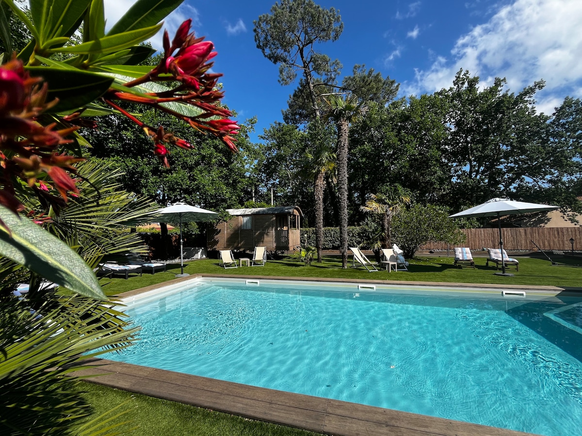 Détendez vous dans ce logement calme et élégant au bord de la piscine chauffée (dispo de 9h00 à 22h00)Dans un jardin verdoyant, vous pourrez profiter du chalet en toute intimité pour vous ressourcer après une journée à la plage (à 10 min en voiture) ou autour du bassin d'Arcachon (10min) Accessibles par pistes cyclables. Parking sécurisé , table de ping pong / pétanque .Ouverture piscine à compter du 01/05 Possibilité de louer une planche de surf à la journée : 15€ PETIT DÉJEUNER INCLUS