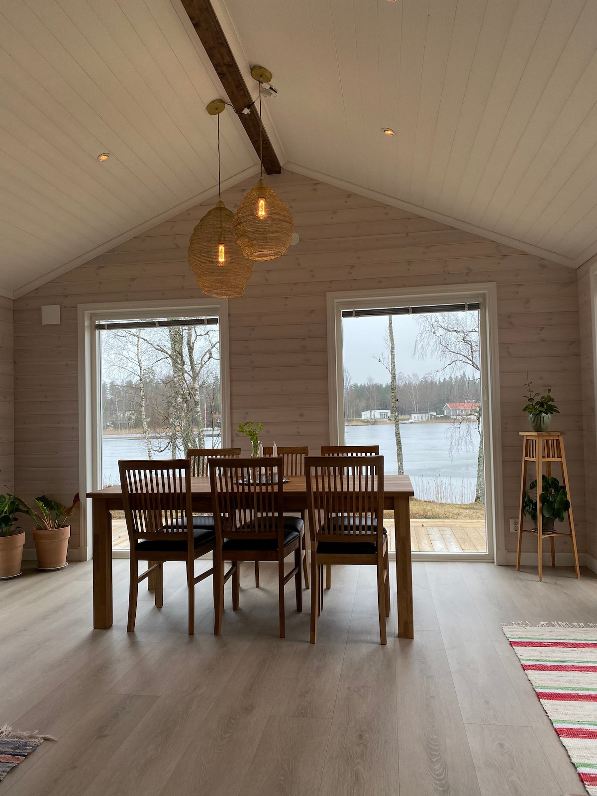The Guesthouse Uddebo is situated right by lake Rosjön, 10 km north of the pretty wooden town of Eksjö. Originally a traditional log cabin the guesthouse was renovated and extended in 2019. The natural garden of Uddebo is surrounded by lake Rosjön on three sides, giving direct access to the water, as well as a magnificient lake view from all parts of the house. From the living room and master bedroom you reach a wooden deck with stairs to the garden and a small jetty.