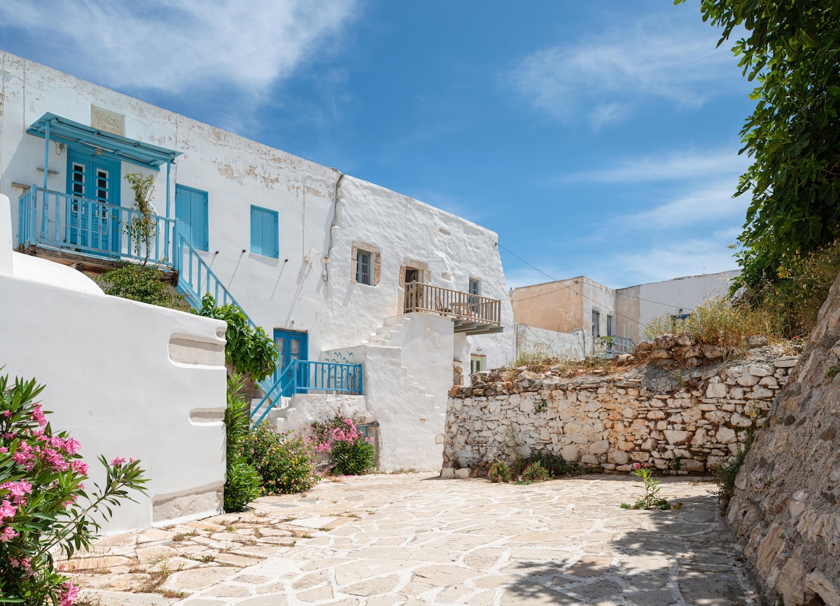 Naša tradicionalna cikladska kamena kuća (65 m2) nalazi se u centru sela i ima prekrasan vrt s limunom, narandžom, naraom, marelicom, avokadom i stablima grožđa, gdje se možete opustiti i uživati u prirodi. Stan ima panoramski pogled na selo i prekrasan pogled na ostrvo Naxos. Kuća je ekološki prihvatljiva,pogodna za rad i ima solarnu energiju. Wi-Fi je pouzdan i za rad. Prihvatamo duže boravke. Sve što vam je potrebno je 20 metara pješice.