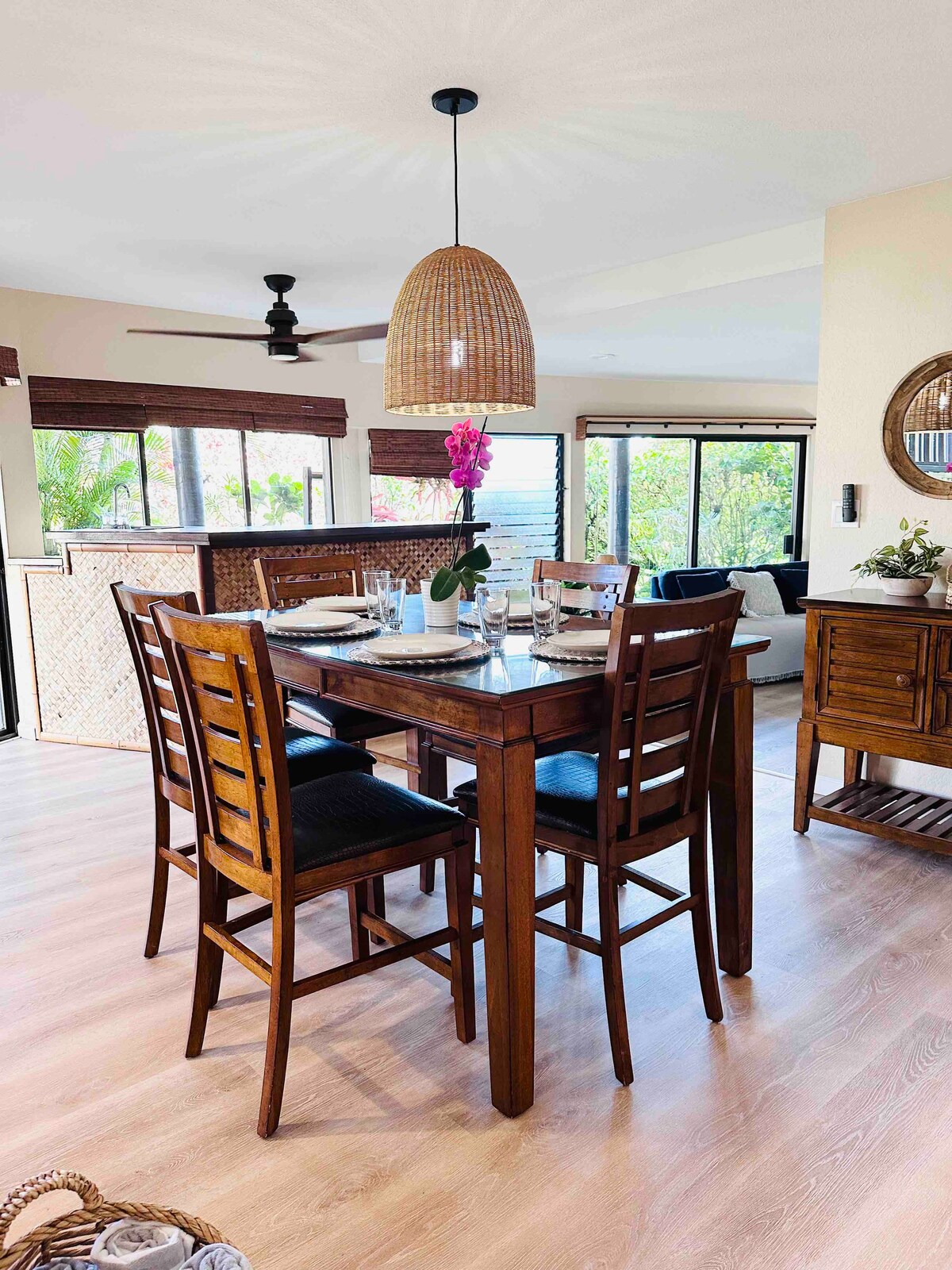 Reimagined 2Bd 2Ba penthouse on a quiet green cliff overlooking Anini Reef. Hale Mōlī is our paradise away from home, thoughtfully curated w/furniture & design for cozy, luxury at the beach. Designed to bring surrounding nature into the unit, sounds of the ocean fill the space. Private entrance w/ views from every room. Corner unit w/AC + beach trail. Enjoy sunsets over Bali Hai (from front door), relax & unwind on the lanai. Great location in Princeville w/easy access to all of North Shore.