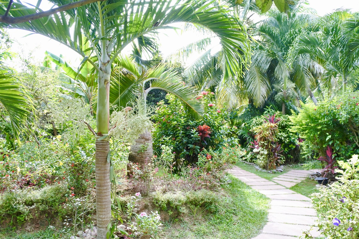 This holiday home is part of a family-run accommodation with only three traditional chalets in a large garden. Enjoy a true island feeling from your open veranda with wooden floors and handmade furniture, surrounded by rare fruits and colourful tropical flowers. The surroundings are village-like, with small shops, a restaurant and two takeaways close by. The sea is about one kilometre away.