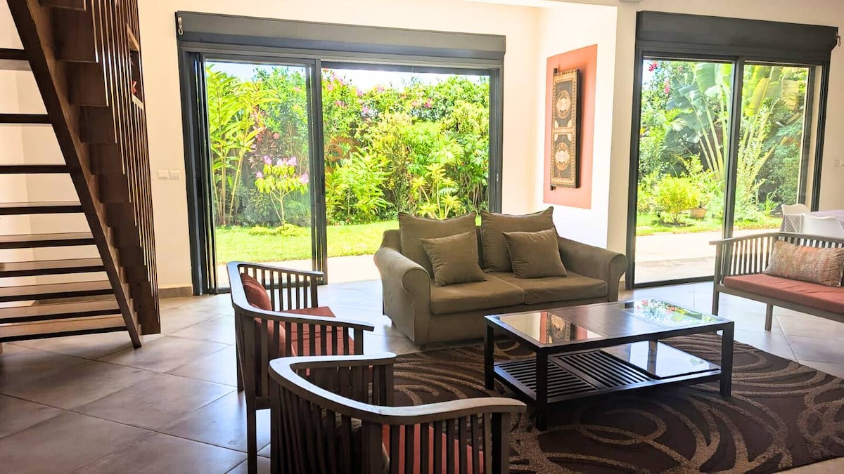 Maison avec piscine dotée d'un grand jardin orné de palmiers se trouvant dans un quartier paisible à proximité du centre ville et des différentes commodités (supermarchés et banques); du fait qu'elle soit bien desservie par la nouvelle rocade. La maison est composée de deux chambres et d'une salle de séjour avec cuisine à l'américaine, meublée avec frigo, four encastré,...L'extérieur est prévue pour l'organisation d'une fête amicale, de barbecue autour de la piscine. La sécurité y est assurée