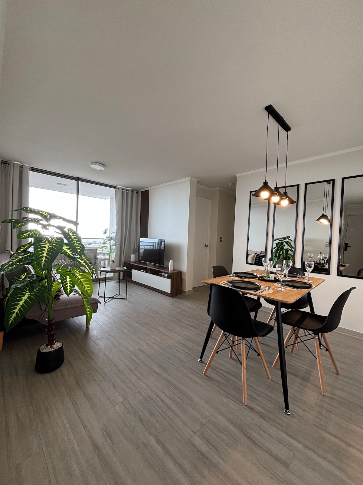 Departamento de un dormitorio, un baño y, un estacionamiento, completamente amoblado, con todo lo necesario para disfrutar de una grata estadía. Consta de una cama de dos plazas (en dormitorio) y un futón en la sala. Consultar de requerir utilizar el futón ya su uso tiene costo adicional por concepto de ropa de cama. Cercano a centros comerciales (Mall), supermercados, parques, áreas verdes, playas, aeropuerto, y otros puntos de interés.