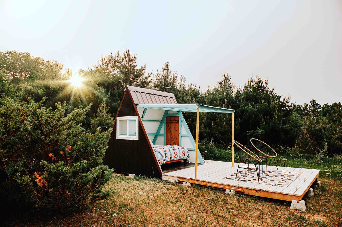 Brvnara s kosim krovom u Lost Woodsu s pogledom na vrh brda