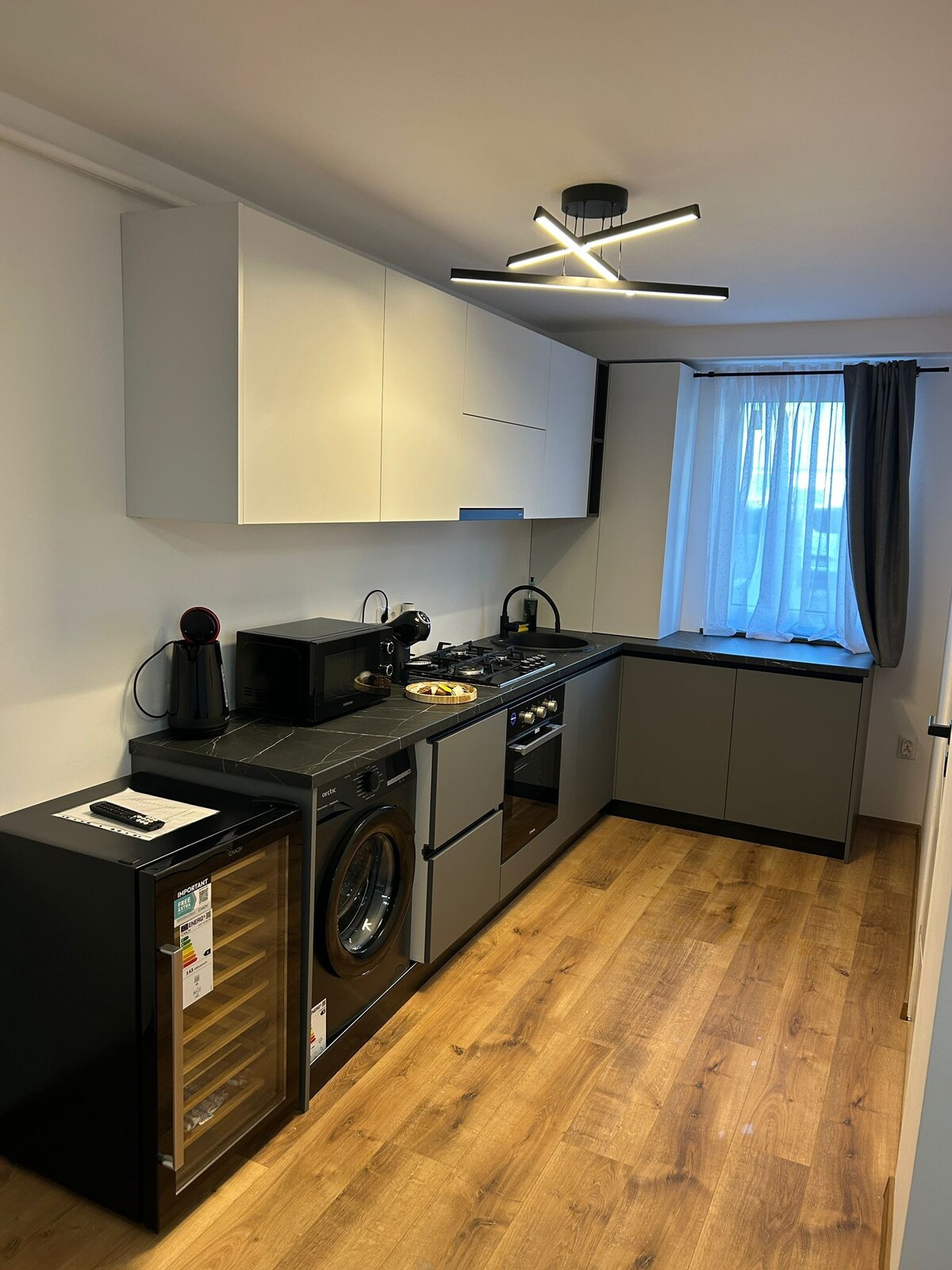 Refugiu de lux lângă aeroport. Bucură-te de un apartament elegant cu pat king-size, Smart TVs, aparat profesional de cafea, încălzire prin pardoseală, parcare privată, complet utilat cu tot ce ai nevoie. Ideal pentru călători, profesioniști sau escapade de weekend. Confort premium la doar câteva minute de terminal.