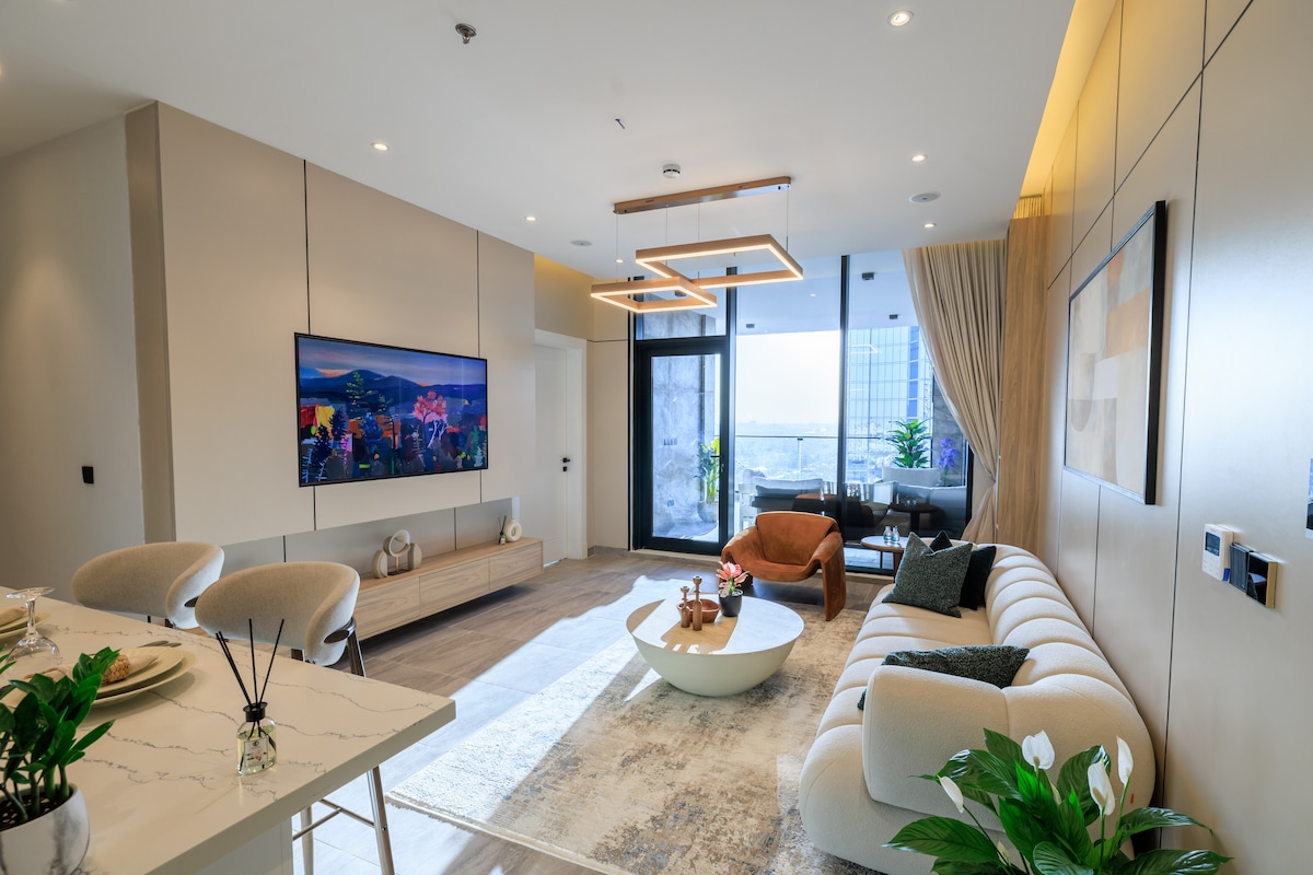 Uživajte u luksuznom boravku u ovom pažljivo dizajniranom i namještenom stanu koji garantuje udobnost i privatnost s panoramskim pogledom na Rijad Funkcije: • Dvije elegantno i udobno uređene spavaće sobe (bračni krevet) • Kada u privatnom dvorištu koja pruža jedinstven doživljaj opuštanja • Vanjski prostor za sjedenje za 6 osoba • Prostrani salon s pametnim TV-om • Potpuno opremljena kuhinja s najnovijim kućanskim aparatima i barom s pogledom na dnevnu sobu • Dva kupatila. Dodatne usluge: • Panoramski pogled na grad • Samostalni dolazak s pametnom bravom • Privatni parking • Brzi internet