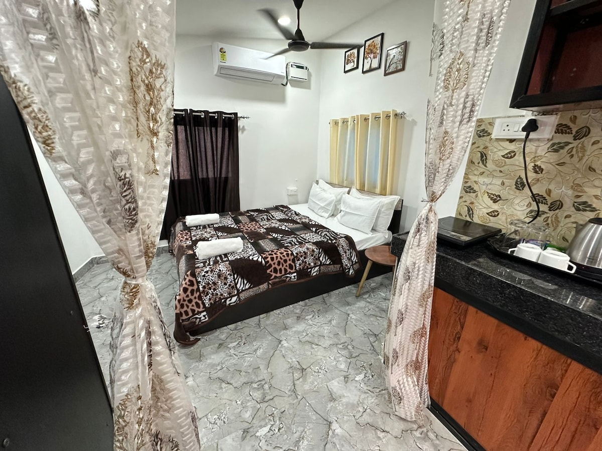 Bright, air-conditioned Verde-Studio at Seven Summers, Mandrem—just a 2-minute walk from Mandrem beach. Enjoy a spacious balcony with lush green views, lots of natural light, free hi-speed WiFi, a fully equipped kitchen, en suite bathroom with hot water, and more. Rooftop access offers sea views. Perfect for solo travelers or couples seeking comfort and a safe environment.