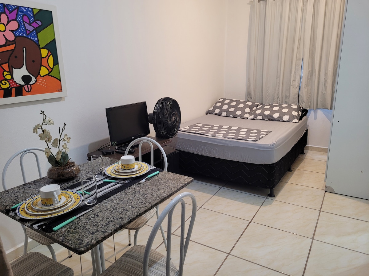 O Studio possui cozinha e quarto integrado, sacada e banheiro. Andar alto com elevador. Uma vaga de garagem. Próximo a rodoviária. Possui uma cama de casal Queen (colchão magnético), com opção de + 1 colchão de solteiro no chão (com cobrança de taxa extra p/ o 3°hospede). *Para que a reserva seja efetivada é necessário informar o nome de todos os hóspedes. O congelador pode não estar disponível, pois utilizamos o apto quando não há reservas. NÃO ACEITAMOS RESERVAS DESTINADAS A ENCONTROS!