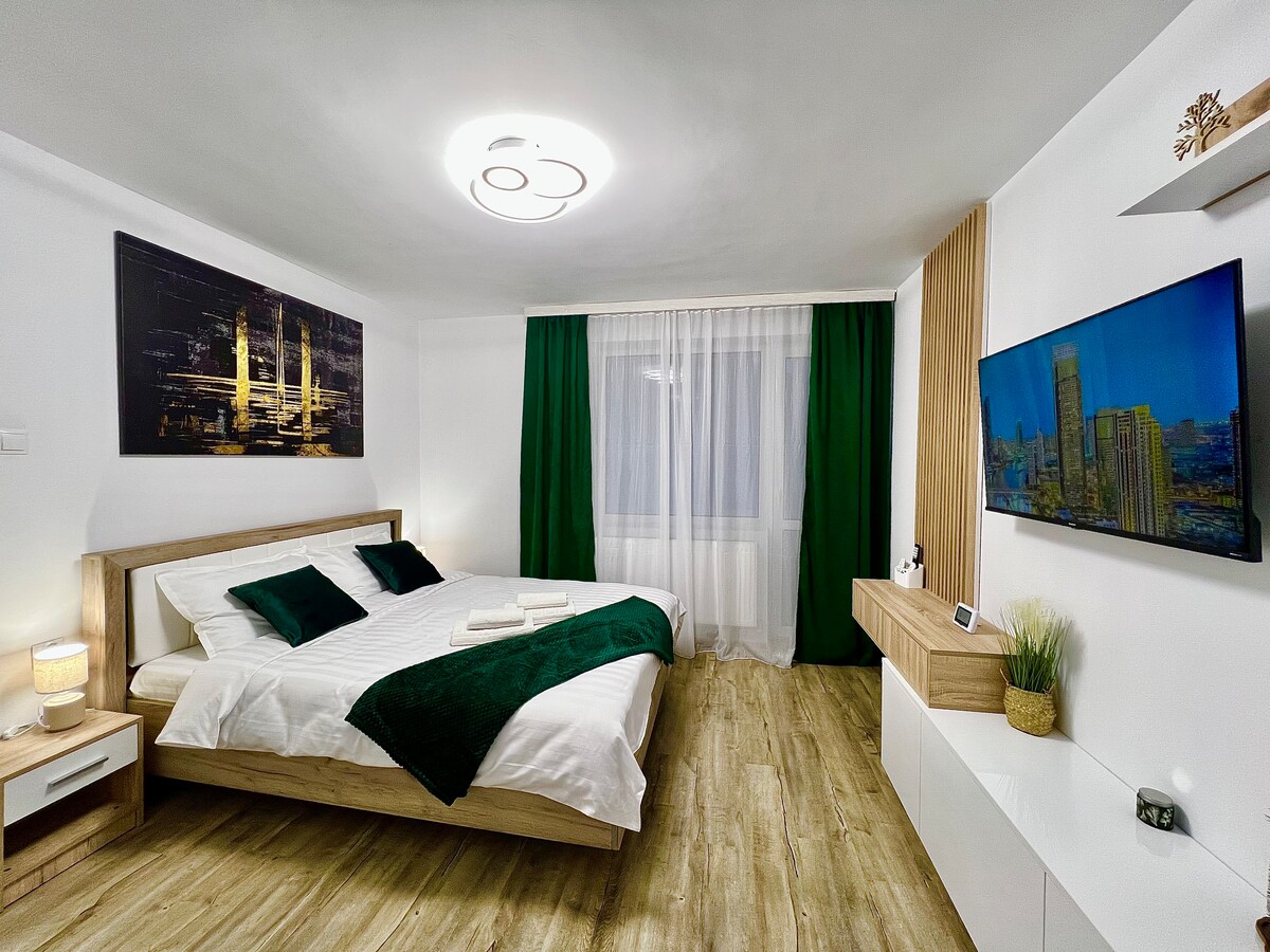 Prolazite li kroz Brancusijev grad ili želite doživjeti novi doživljaj? Zeleni stan vam je na raspolaganju! Nudimo vam udoban, novouređen i ukusno uređen stan. Ima sadržaj: Smart TV, WI-FI, kuhinju, kupatilo i spavaću sobu. Stan se nalazi u mirnom području opštine Târgu-Jiu, 5 minuta hoda prema Shopping Cityju Târgu-Jiu . Dođite u naš grad!