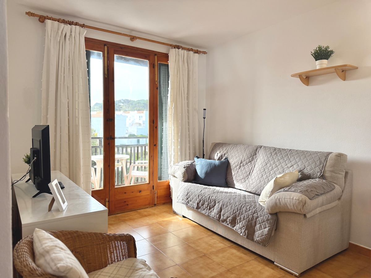 Acogedor apartamento de 40 m² con 2 terrazas privadas y vistas al mar, ideal para relajarse en Menorca. 1 habitación, 1 baño, salón con cocina integrada y 2 camas de matrimonio (para 4 personas). Perfecto para parejas o familias pequeñas. Situado en un complejo familiar tranquilo con zonas verdes, cerca de supermercados, parada de autobús y GR. A solo 200 m de la bahía de Arenal d’en Castell, disfruta de sol, mar y actividades al aire libre. ¡Vacaciones inolvidables con todas las comodidades!