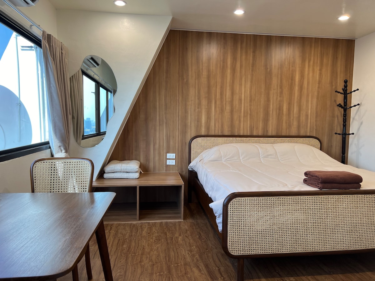 Doživite modernu udobnost u našoj svježe renoviranoj sobi, na korak od BTS Arija. Uživajte u zadivljujućem pogledu na grad i zalazak sunca s velikih prozora, savršenih za opuštanje nakon cjelodnevnog istraživanja Bangkoka. Naš smještaj ima dekor inspirisan sredinom vijeka, udoban bračni krevet i miran ambijent. Praktično smješten u blizini modernih kafića, lokalnih tržnica i javnog prevoza, idealan je za urbane istraživače koji traže elegantno utočište u srcu grada.