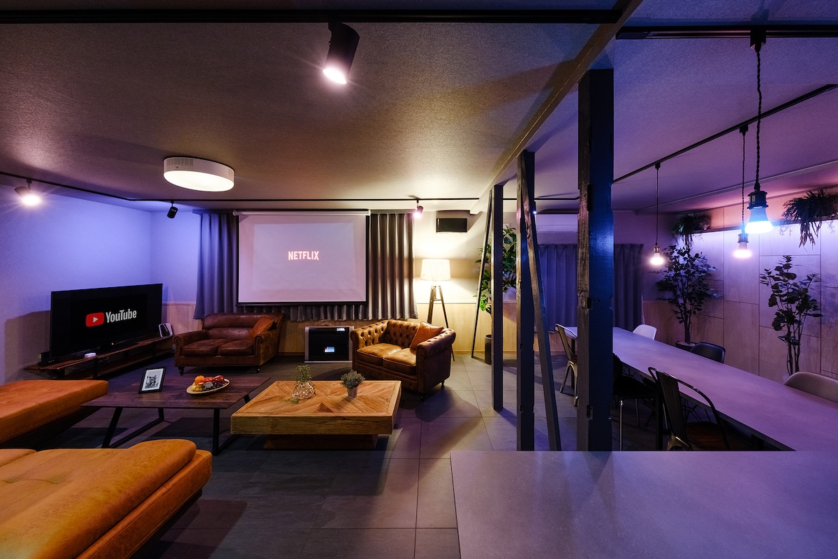 【美瑛テラス1F】1F専用独立玄関 78平米ワンルーム/ ソファベッド/170型シアター/シャワー