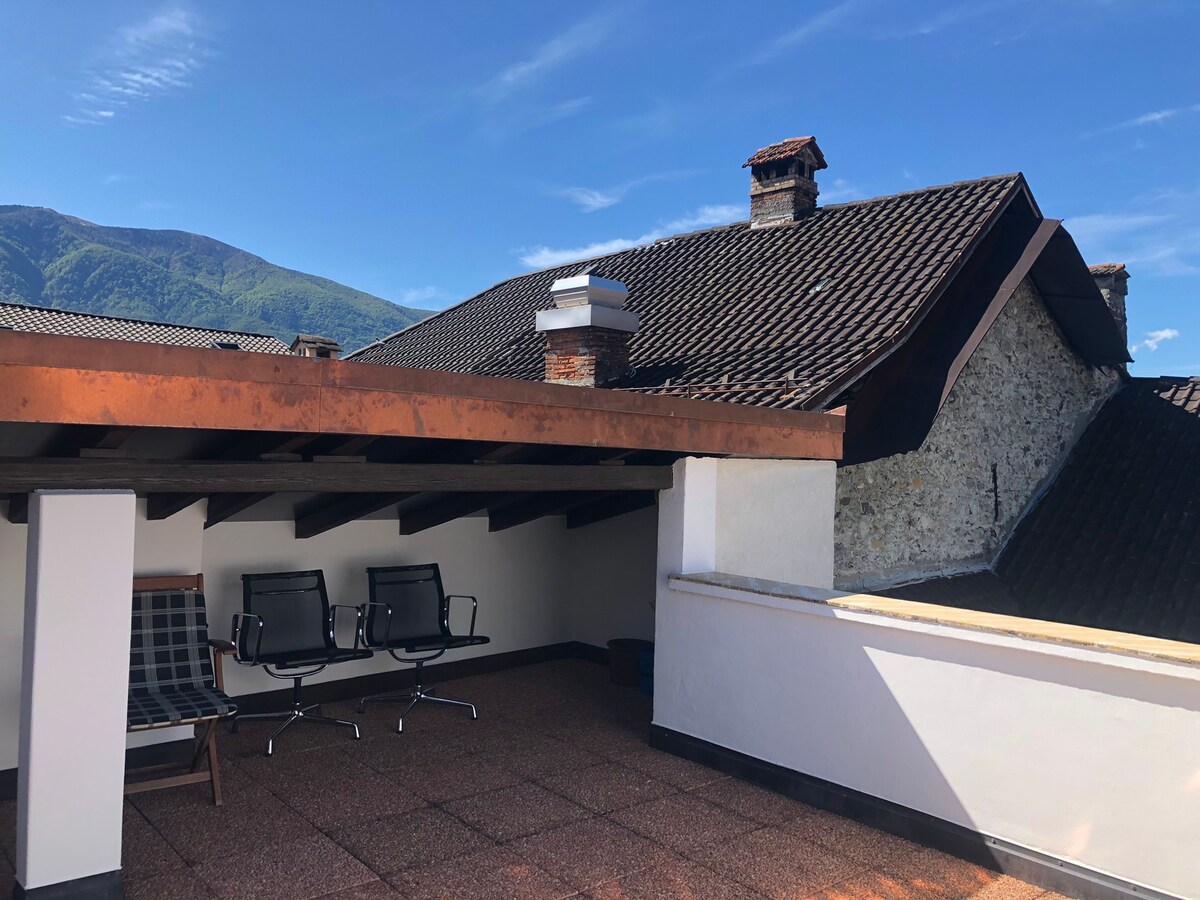 Karakteristično potkrovlje u selu Ascona ,smješteno na trećem i posljednjem spratu . Idealno za dvije osobe koje mogu uživati u vrlo velikoj terasi od 30 m2 Studio je opremljen kuhinjom opremljenom mašinom za suđe ;velikim stolom, ormarom i 2 kreveta postavljenim zajedno, ali odvojivim Wi-Fi , TV, besplatni peškiri, veš mašina i sušilica. Turistička taksa se već računa na korisničkom računu na Airbnbu