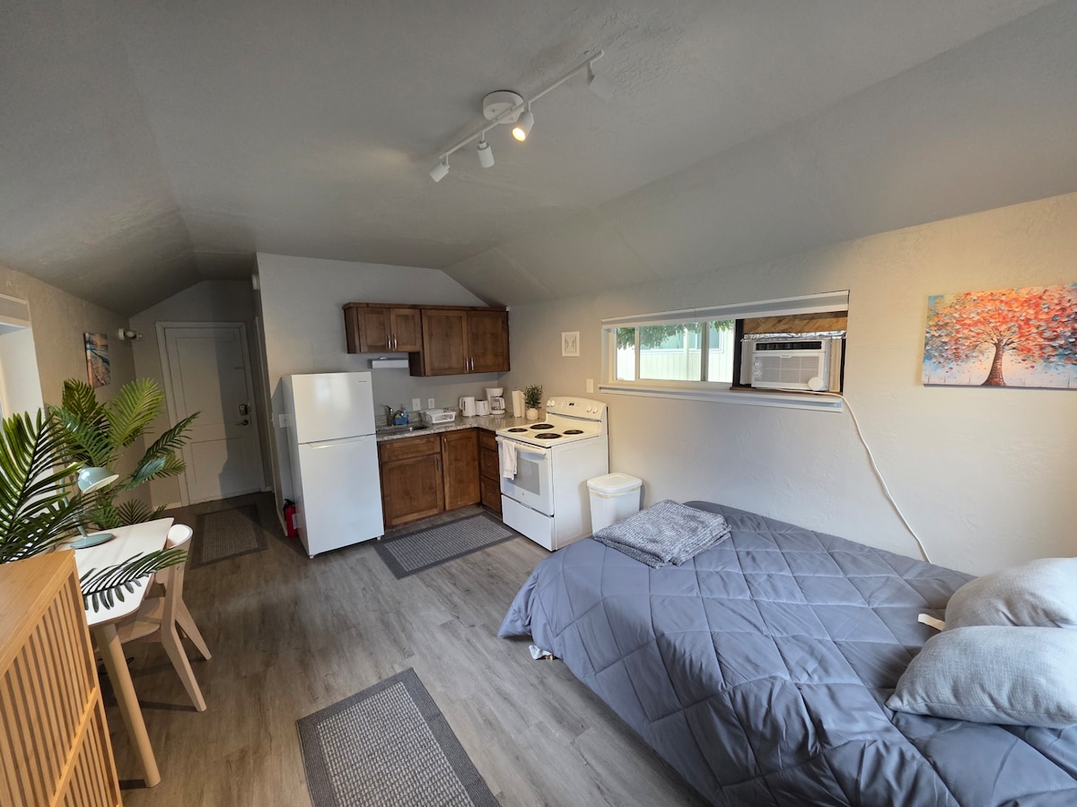 Uživajte u elegantnom iskustvu u ovom potpuno novom studio apartmanu koji se nalazi u centru grada u mirnom okruženju! Svijetla, čista i udobna — savršen dom daleko od doma. 1 bračni krevet 1 studio za kupatilo sa kuhinjom koja se nalazi manje od milje do historijske propusnice za grad u centru grada, gdje ćete pronaći nevjerovatne lokalne restorane i kupovinu! Prostor je udaljen milju od I-5 i milju i po do prekrasne rijeke Rogue. Gosti će imati pristup vlastitom privatnom ograđenom dvorištu sa svjetlima, ognjištem i roštiljem.