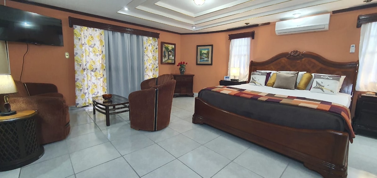The La Ceiba Room at Casa de los Gálvez offers a private, spacious escape in the heart of La Ceiba. Enjoy a large bedroom decorated with a Honduran theme, an en-suite bathroom, a walk-in closet, a living room, a work area, and a fully equipped kitchen. Situated near the ocean, El Paseo de los Ceibeños, and nightlife, yet it remains peaceful. Includes a private garage, A/C, and all essentials. Perfect for both short and long stays, this property combines comfort with local charm.