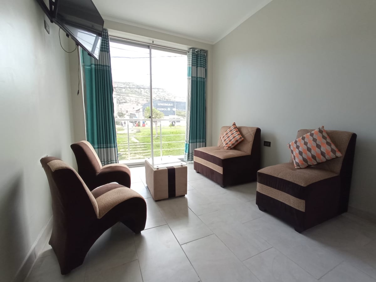 Te damos las más cordial bienvenida a Ayacucho, nuestra ciudad heroica. El departamento es muy acogedor, amoblado con todo incluido , sala , cocina , comedor, sala , baño completo con agua caliente, con camas suaves, también para familias con niños; está muy bien ubicado a 10 minutos de la plaza de armas,5 minutos del terminal terrestre, 20 minutos del aeropuerto, disfruta de una zona residencial tranquila, segura, cerca a tiendas,farmacias, mercados y transporte público y privado.
