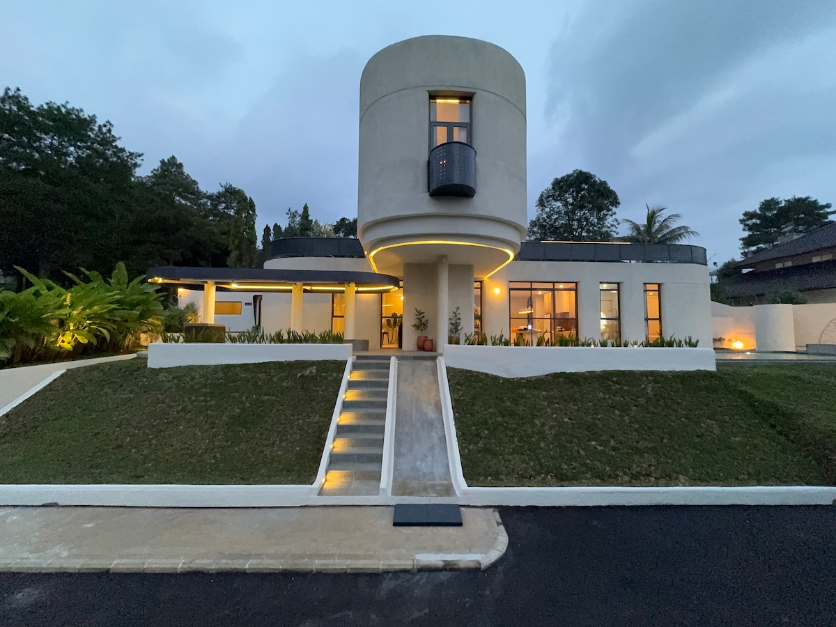 Pobjegnite iz grada u ovu privatnu tropsku kuću sa zadivljujućim pogledom na planine. Uživajte u prostranim sobama s velikim prozorima, velikom terasom, vanjskom trpezarijom, bilijarskim stolom i brzim Wi-Fi mrežom. Savršeno za porodice, parove ili osobe koje rade na daljinu. Okružen prirodom, s prostranim parkingom i sigurnim nadzornim kamerama. Jednostavan pristup putem alternativne rute Puncak - čeka vas mirno utočište!