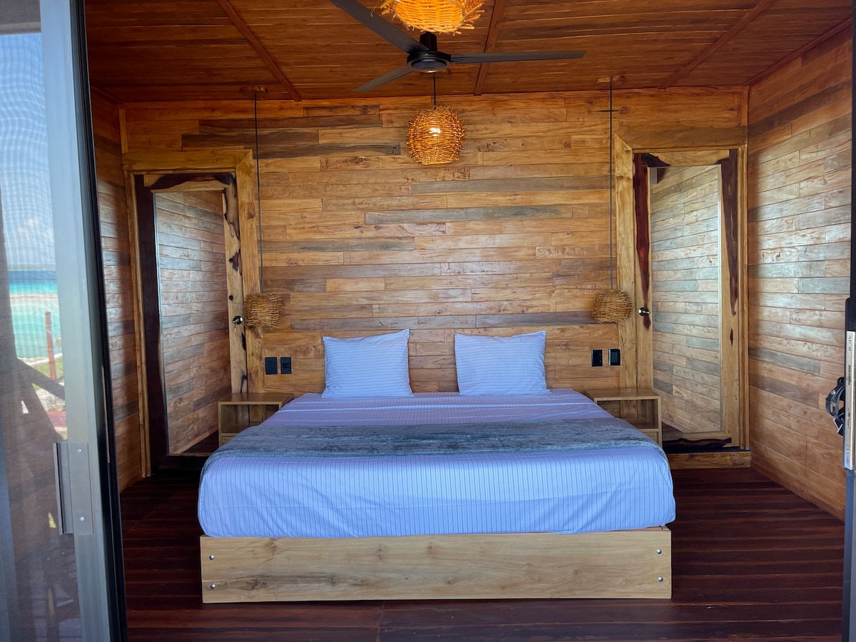 esta Casa Belizeña cuenta con 2 habitciones 1 cama king otra con 2 camas matrimoniales y una cama king size en la sala cocina completa equipada estufa ustencilos para cocinar refrigerador con 1 cerveza 1 coca y 1 cafe que se repone diario A/C tv pantalla netflix ventilador closet baño privado shampo jabon de cuerpo acondicionador ... terraza con vista a la laguna incluye paddel kayak de uso gratuiito tambien hemoso jardin y muelle con palapas el el agua 1 verdadero paraiso bienvenidos.