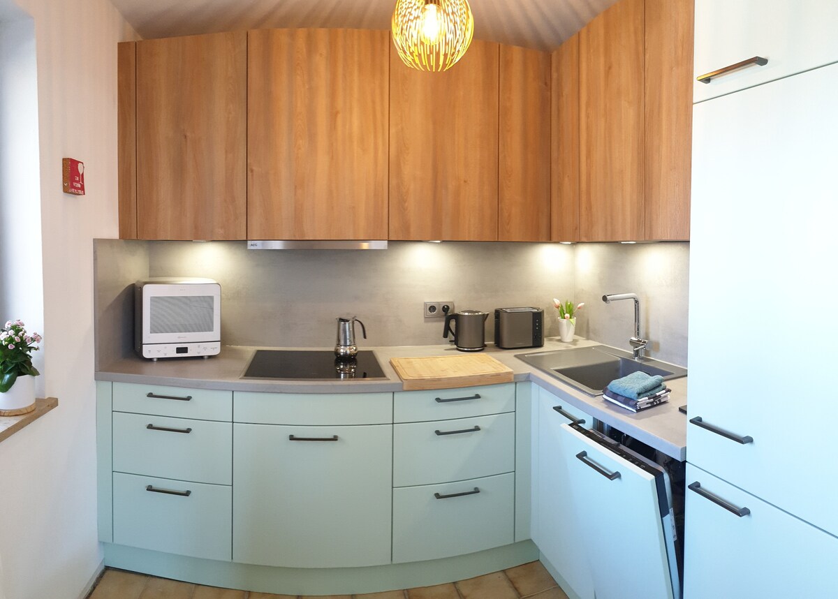 S ljubavlju namješten, osvijetljen stan s vlastitim ulazom iz vrta nalazi se u naselju na Halblechu. Ima 43 m2, a dnevni i spavaći prostor nisu odvojeni vratima. Stan je pogodan za parove ili porodice s najviše dvoje djece. Bračni krevet (180 x 200) i kauč na razvlačenje 140 x 195 nude dovoljno prostora. Mala čajna kuhinja je opremljena indukcionom pločom za kuhanje, frižiderom i sudoperom.