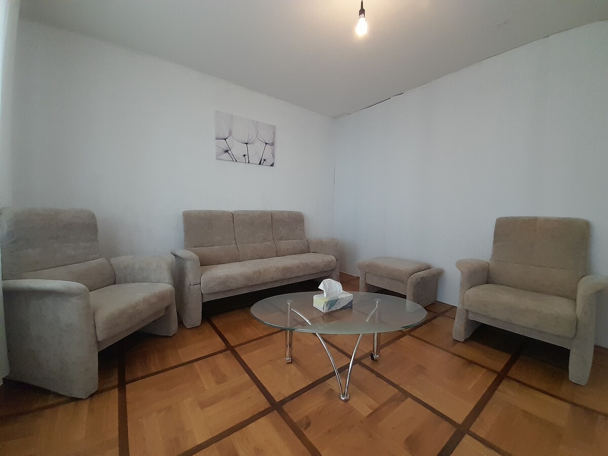 Stan je u podrumu moje kuće. Stan koriste samo za sebe, a imaju i vlastiti ulaz. Dnevni prostor je svijetla prostorija i ima površinu od oko 26 m2. Sofa služi kao mogućnost spavanja i ima širinu od 1,40 m i dovoljna je za 2 osobe. Na sofi je pjenasta presvlaka od oko 6 cm. Još jedna opcija spavanja je normalan krevet. Parking je dostupan u neposrednoj blizini.