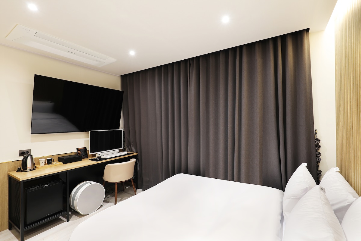 [호텔벨라] 원룸형 신축 건물 숙소로 2인이 이용하기에 적합한 공간입니다. 📌 매일 침구류 교체 📌 세면대 led 필터 사용 📌 세스코 방역 📌 저희 숙소에서는 락스나 강한 화학 세제는 사용하지 않습니다. 피부가 예민하신 분들도 안심하실 수 있도록 일반 세제를 사용하여 관리하고 있어요. 화학 약품 냄새 없이, 보다 편안하고 건강한 숙소를 지향합니다. 🚗 차량 등록시 선착순 무료 주차 가능 (76대) 💛 체크인은 4시, 체크아웃은 12시입니다 💛 (비대면 체크인 원칙으로 하고 있습니다) *넷플릭스, 쿠팡플레이 자동로그인 되어 있어요. *왓챠, 티빙, 디즈니, 유튜브 등 (개인 계정 로그인시 가능)